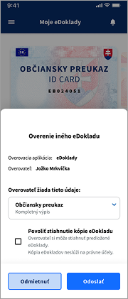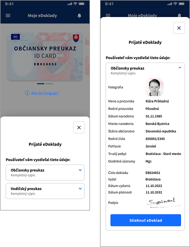 Ak to predkladateľ dokladu povolí, overovateľ si môže stiahnuť PDF dokument, v ktorom budú údaje z dokladu. Toto môže poslúžiť napr. ak chcete aby niekto vyplnil vaše údaje na zmluvu ale bude to robiť neskôr. Dokument s údajmi dokladu nie je kópia dokladu a neslúži na právne účely. Obsahuje ale všetky údaje z dokladu, vrátane fotografie.