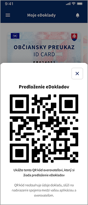 Predkladateľ dokladu otvorí aplikáciu eDOKLADY, prihlási sa a klikne na tlačidlo Predložiť doklady. Na obrazovke sa zobrazí QR kód, ktorý slúži na nadviazanie komunikácie s aplikáciou overovateľa.