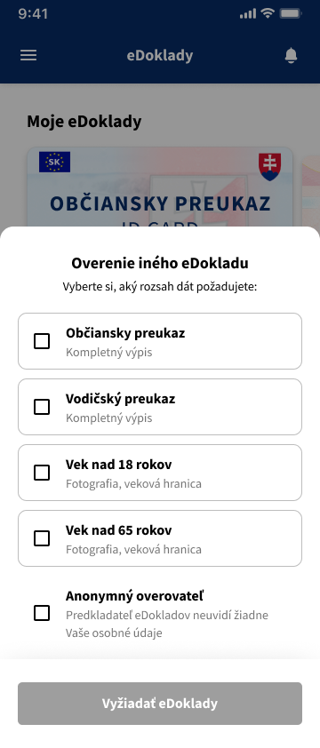 Aplikácia ďalej umožňuje využitie funkcie „Overenie veku nad 18 rokov“ a „Overenie veku nad 65 rokov“.